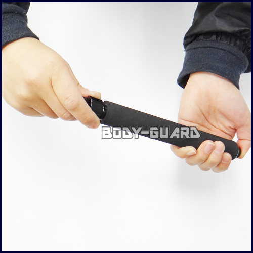 警棒を振り出し、その勢いでシャフト同士を摩擦でロックさせ、