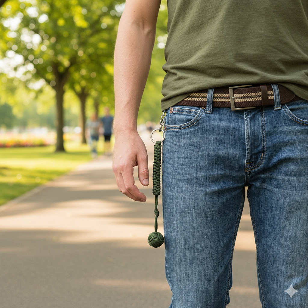 丸い部分に鉄球が入っている、キーホルダーのような護身用品です