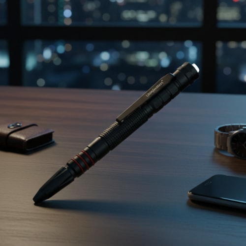片方は通常のペン、反対側はガラス割りやLEDライトとしてご利用できる護身用のペンです。