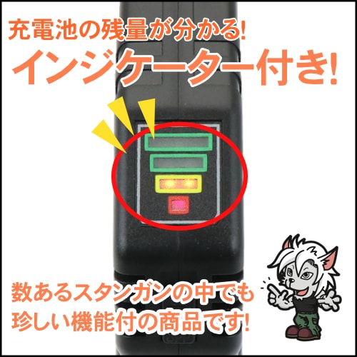 ・フラッシュライト ・スタンガン(放電音、放電光) ・電池残量の分かるインジケーター