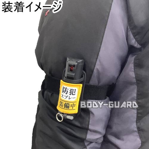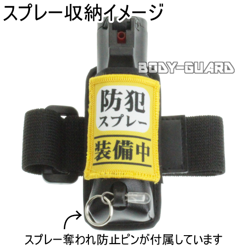 ホルスター本体、ゴムベルト、「防犯スプレー装備中」ワッペン、スプレー奪われ防止ピン