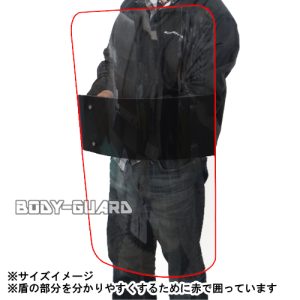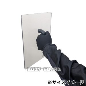 強化ガラスよりも高い強度を持ち、耐衝撃・耐熱性に優れ、透明・軽量化を実現したプラスチック素材「ポリカーボネート」の防護盾は、透明部分が多く視野が狭くならないので、盾を構えている状態でも相手の行動を警戒しやすいです。